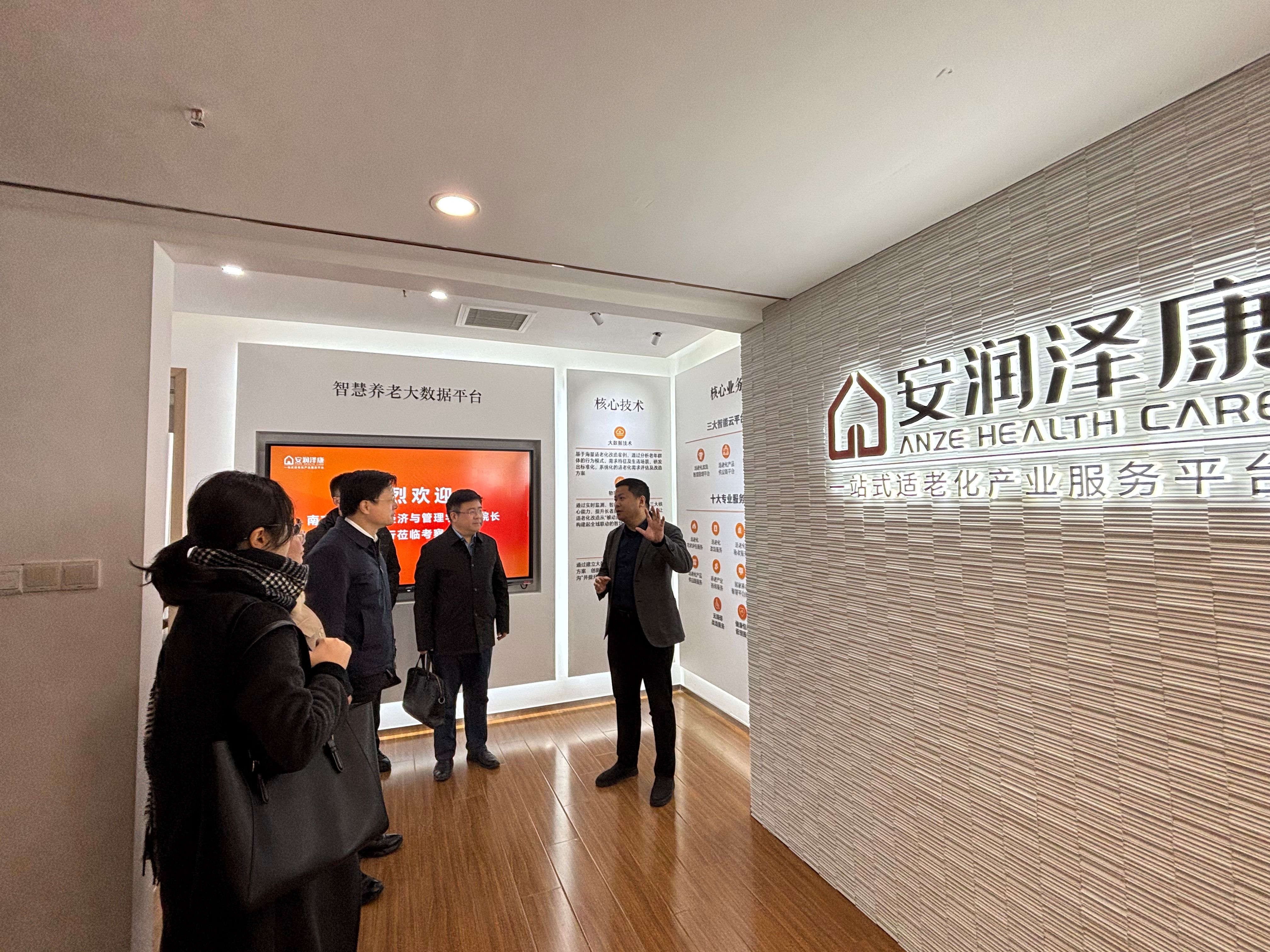 1月24日,经济与管理学院副院长张长江、吴翔华教授、MBA/MEM/MPAcc教育中心副主任王万竹、王磊副教授、王晨迪老师一行,应邀赴安润泽康(南京)健康科技有限责任公司开展参访调研活动。公司创始人张祺、副总裁赵志伟、合伙人杜本旭、项目经理陆皓天、招商经理周梦云热情接待了我院师生一行。杜本旭为我校2018级MBA校友。