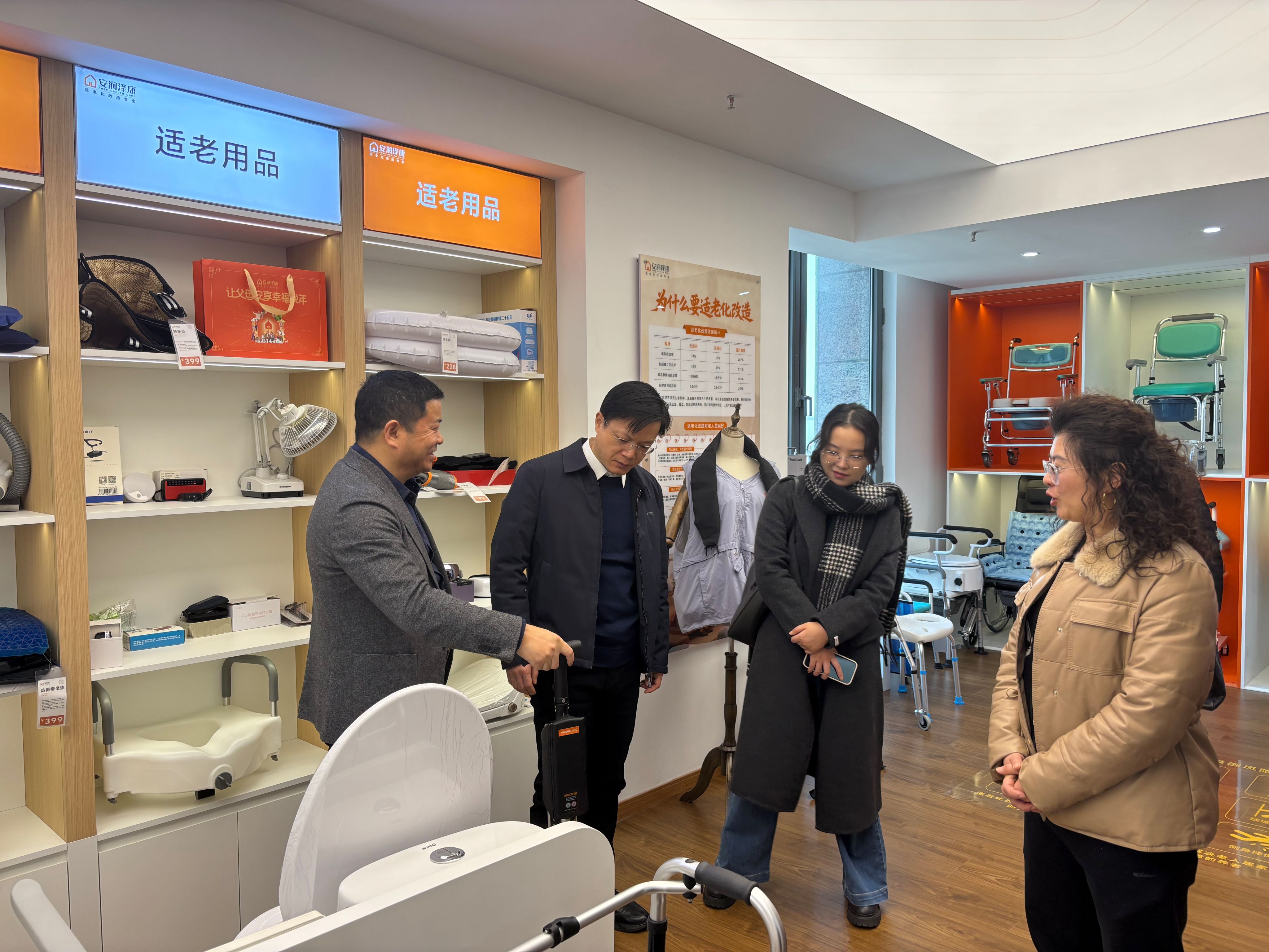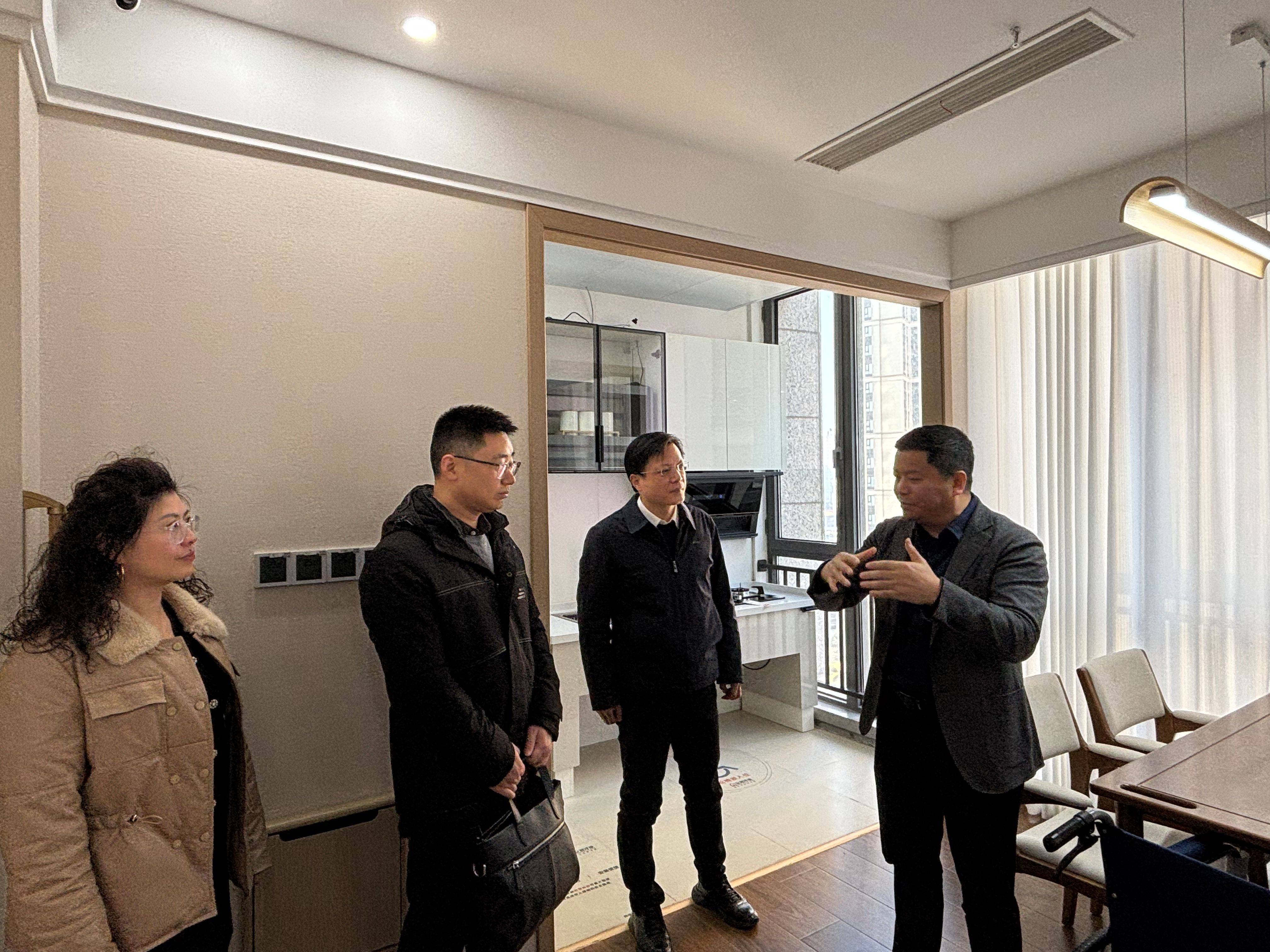 参访伊始,公司创始人张祺向师生们系统介绍了企业愿景、企业荣誉及专利、改造案例等发展情况。随后,师生们走进安润泽康适老化体验中心,沉浸式感受“场景化、智能化、全链路、全周期”的适老化服务模式。体验中心内,防滑地面、智能监测设备、适老家具等改造细节一应俱全,公司创始人张祺详细演示了智能养老平台的操作流程,讲解了适老化产品从研发设计到落地应用的全链条服务流程,让师生们直观领略到科技如何为银发群体重塑高品质生活。