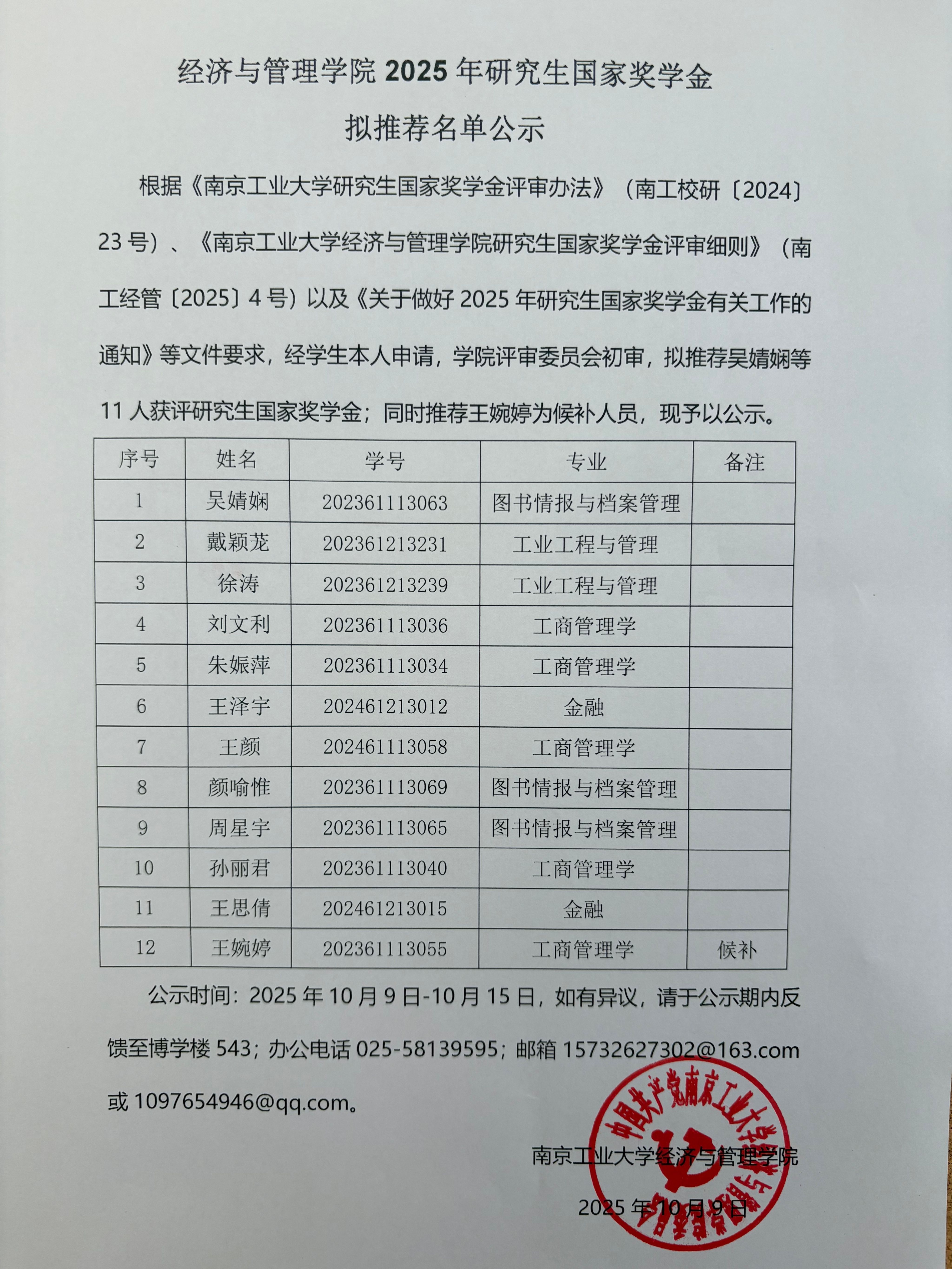 经济与管理学院2025年度研究生国家奖学金初审名单公示